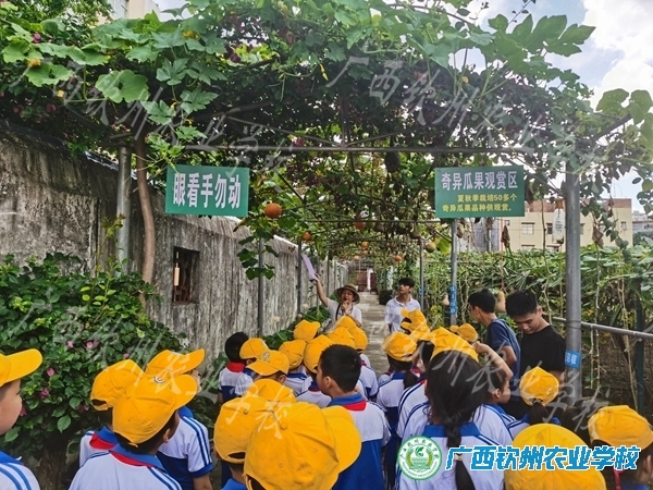我校充分发挥全国科普教育基地、青少年农业科普示范基地作用,组织专业教师进行科普与指导。在昆虫馆,我校邓万超老师绘声绘色讲解昆虫的基本特征,科普昆虫常识,一一介绍学生常见的蝴蝶、飞蛾、蜻蜓、蜜蜂等昆虫标本和不常见的竹节虫、天牛、金龟子等昆虫标本,以及昆虫危害叶与正常叶的区别,拓宽学生学习知识面,激发学生热爱农业、探索自然的兴趣。在现代农业试验示范园,我校梁秀芳老师带领学生穿梭奇异瓜果观赏区,欣赏瓜果奇妙之处;深入田间示范移栽苦瓜苗,锻炼学生种植本领;指导学生在育苗杯播种青瓜、豆角种子,科普种子从萌发到收获的全过程;到采摘区体验果蔬采摘,亲身感受劳作带来的快乐。