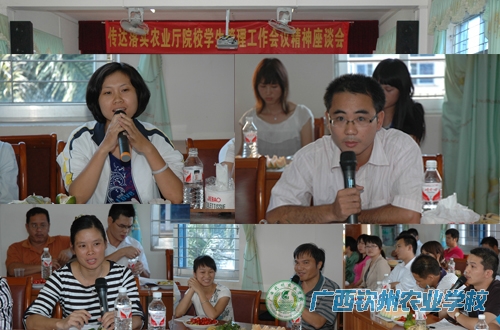 2011年9月24日下午,我校召开了传达落实自治区农业厅属院校学生管理工作座谈会精神的座谈会。参加座谈会的有学校领导刘波校长、分管学生管理工作的伍国樑副校长、学生科全体人员和全体班主任。
