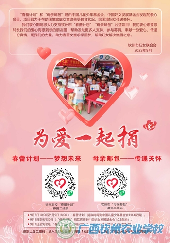 “春蕾计划”和“母亲邮包”是由中国儿童少年基金会、中国妇女发展基金会发起的爱心项目,项目致力于改善困境家庭女童受教育状况,帮助妇女解决困难。为响应钦州市妇联号召,在2023年“99公益”日,我校妇委会向全体师生发起“为爱一起捐”活动倡议。涓涓细流,汇聚成海。收到倡议后,老师和同学们纷纷伸出爱的双手,传递爱的温暖。截至活动结束时,我校师生共计捐款3808.11元,以实际行动为钦州的困境妇女儿童献出一份爱心。