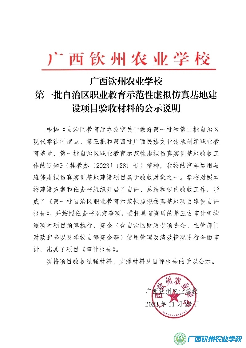 广西钦州农业学校第一批自治区职业教育示范性虛拟仿真基地建设项目验收公示