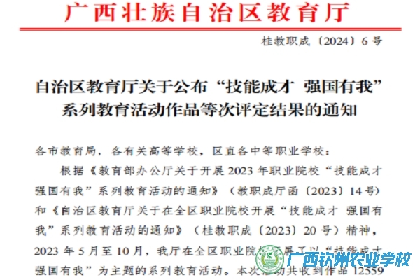 近日,自治区教育厅公布了“技能成才 强国有我”系列教育活动作品等次评定结果 ,我校共获奖138项,其中一等奖7项、二等奖55项、三等奖78项。由于组织工作有力,成绩显著,我校还获评“优秀组织单位”。