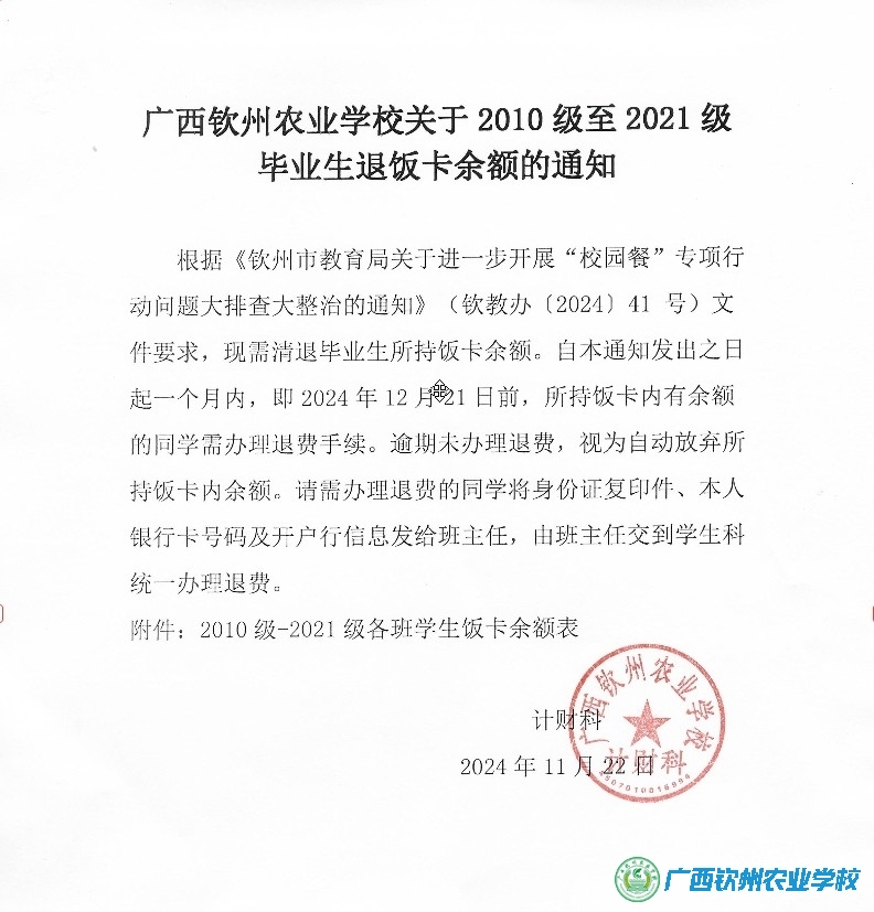 广西钦州农业学校关于2010级至2021级 毕业生退饭卡余额的通知