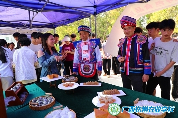 文艺表演环节结束后,全体师生接着到文化广场参加民族文化特色研学实践活动,烹饪、面点、食品加工专业的师生准备了糕点、五色米饭、油茶等美味的特色食品,幼儿保育专业以及园林专业师生制作了精美的手工和非遗作品在现场进行展示,同学们通过参与板鞋竞走、抛绣球、跳竹竿、非遗插花体验等活动领取兑换券在活动现场兑换美食、手工作品和纪念品,现场充满欢声笑语,其乐融融,师生一起在钦农度过了一个难忘的节日。