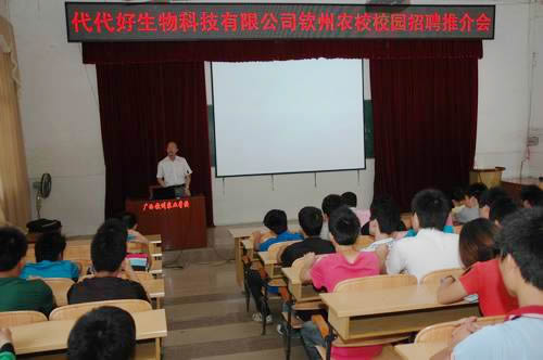本次推介会是我校就业办积极联系,邀请企业到学校开展的招聘推介活动之一,我校2010级养殖专业全体学生参加了推介会。会上,代代好公司梁志延销售副总经理详细介绍企业的生产、管理和企业文化,并对招聘要求等做了具体说明。最后,经过层层筛选,我校30多名同学与招聘公司达成了初步就业意向。