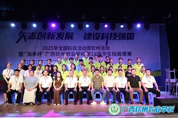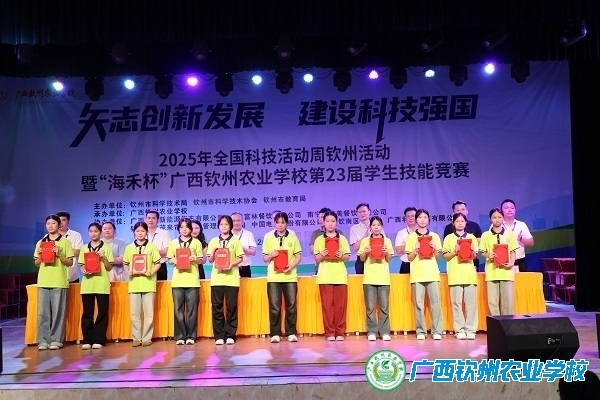 5月20日下午,我校在大礼堂举行2025年全国科技活动周钦州活动暨“海禾杯”第23届学生技能竞赛颁奖仪式。党委书记伍国樑、校长梁文宇,副校长李运光、邓业斌等领导班子成员和广州海禾新能源汽车有限公司经理苏波庆、广西富林餐饮服务有限公司总经理傅世彬、南宁鲜而美餐饮管理有限公司经理兰曾艳、钦州市鑫茂来市场开发管理有限公司经理陆重霖、广西利昇贸易有限公司经理利冰等特邀嘉宾到场与获奖师生共享荣耀与喜悦。本次颁奖仪式由教务科副科长李彬彬主持。
