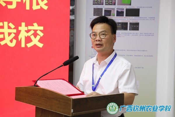 介绍交流:钦州市侨联党组书记刘晖(中),广西钦州农业学校党委书记伍国樑(左)、校长梁文宇(右)