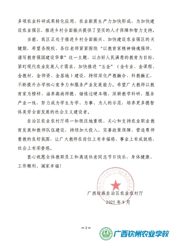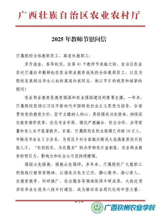 广西壮族自治区农业农村厅2025年教师节慰问信