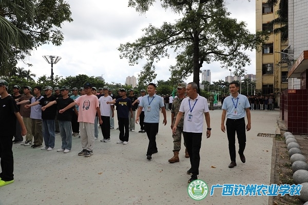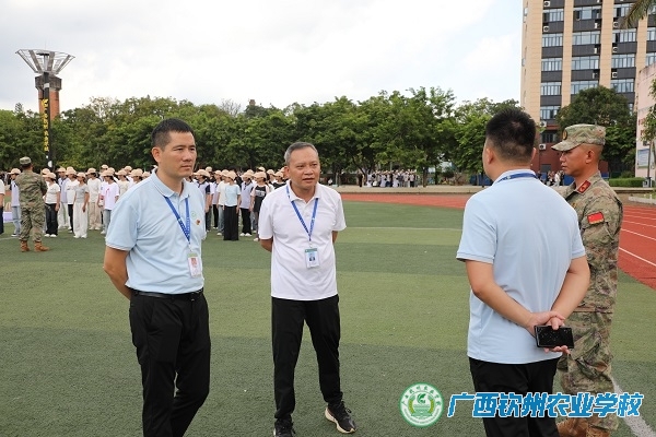 9月3日上午,我校校长梁文宇、副校长邓业斌,会同学生科科长陈贵才,前往学校大操场与校园内主干道,看望慰问正在开展军训的学生,钦州市钦南区人民武装部带队教官李中华全程陪同。