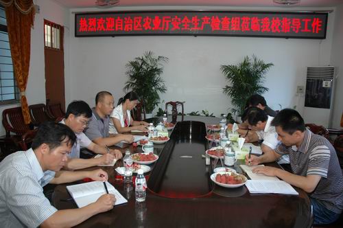 7月12日,以自治区农业厅办公室陈德文调研员为组长的安全生产检查组一行3人莅临我校检查指导工作,我校领导伍国樑副校长(主持工作)、覃一静副校长、覃效敏副校长及相关科室负责人陪同了检查。