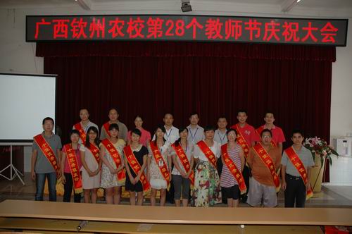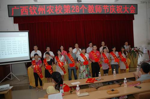 大会在雄壮的国歌声中拉开了序幕,首先由覃一静副校长宣读了自治区农业厅和我校致广大教职员工的节日慰问信,接着学生代表也发表了对老师们的感恩之情和良好祝福;然后覃效敏副校长宣读了2011-2012学年度的表彰决定,大会表彰了2011-2012学年度的“十佳优秀班主任”、“十佳优秀教师”、优秀教育工作者并举行颁奖仪式,颁奖仪式后,“十佳优秀教师”代表莫莉莉,“十佳优秀班主任”代表王娌莉分别作了经验介绍。