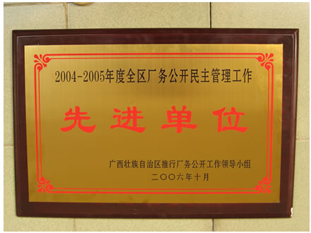 近年来,学校遵照《全国教育工会关于推行校务公开工作的意见》,以“三个代表”重要思想为指导,贯彻落实十六大以来的路线方针政策,树立科学发展观,紧密结合学校实际,积极推行校务公开工作,加快学校民主管理和民主监督建设的步伐,充分调动了教职工积极性;通过校务公开,促进校风、学风呈良好发展态势,各项工作顺利进行,学校的办学竞争力保持在广西的前列。特别是在推行校务公开工作中取得了优异成绩,最近荣获自治区2004——2005年度全区厂务公开民主管理工作“先进单位”,受到自治区推行厂务公开领导小组的表彰。
