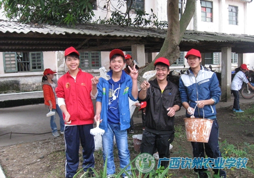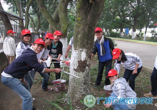2013年1月15日下午4点半,我校近120名青年志愿者在紧张的复习考试之余,抓住天气转晴的好时机给全校的行道树粉刷石灰水。在粉刷活动中志愿者们细致认真,气氛活跃,在做好事中学习体会“钦农是我家 美丽靠大家”的含义,粉刷后的校园行道树不仅更加整齐美观,而且对树木安全过冬、预防病虫侵害也具有积极的作用。