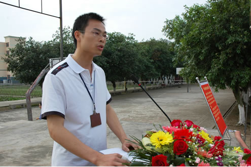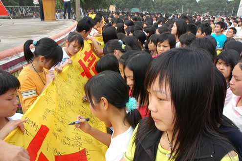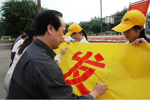 活动仪式现场(二)团委杨宁远书记主持仪式办公室陈明强主任介绍活动背景学生科黄小海科长宣读倡议书学生代表范勇南同学代表全体学生表决心教师代表伍岳锋老师代表全体教工表决心党办黄天伟主任带领师生员工庄重宣誓刘波校长等学校领导签名师生们签名签名的横幅