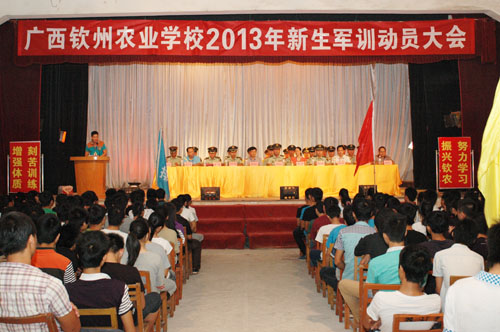 学生科邓业斌科长宣读了2013年新生军训计划。此次军训从9月23日起,到30日结束。军训内容以队列训练为主,同时进行国防教育、内务训练、教唱革命歌曲、拔河比赛等。学生代表汽车133班杨春莲同学就参加此次军训做了发言,她表示认真学习军队的优良作风,学习他们标准的军训动作,学习他们崇高的人格魅力,展现钦农学子奋发向上的决心和无限的青春活力。