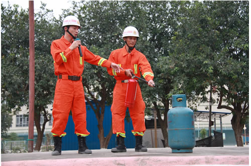 消防官兵演示灭火器的使用方法