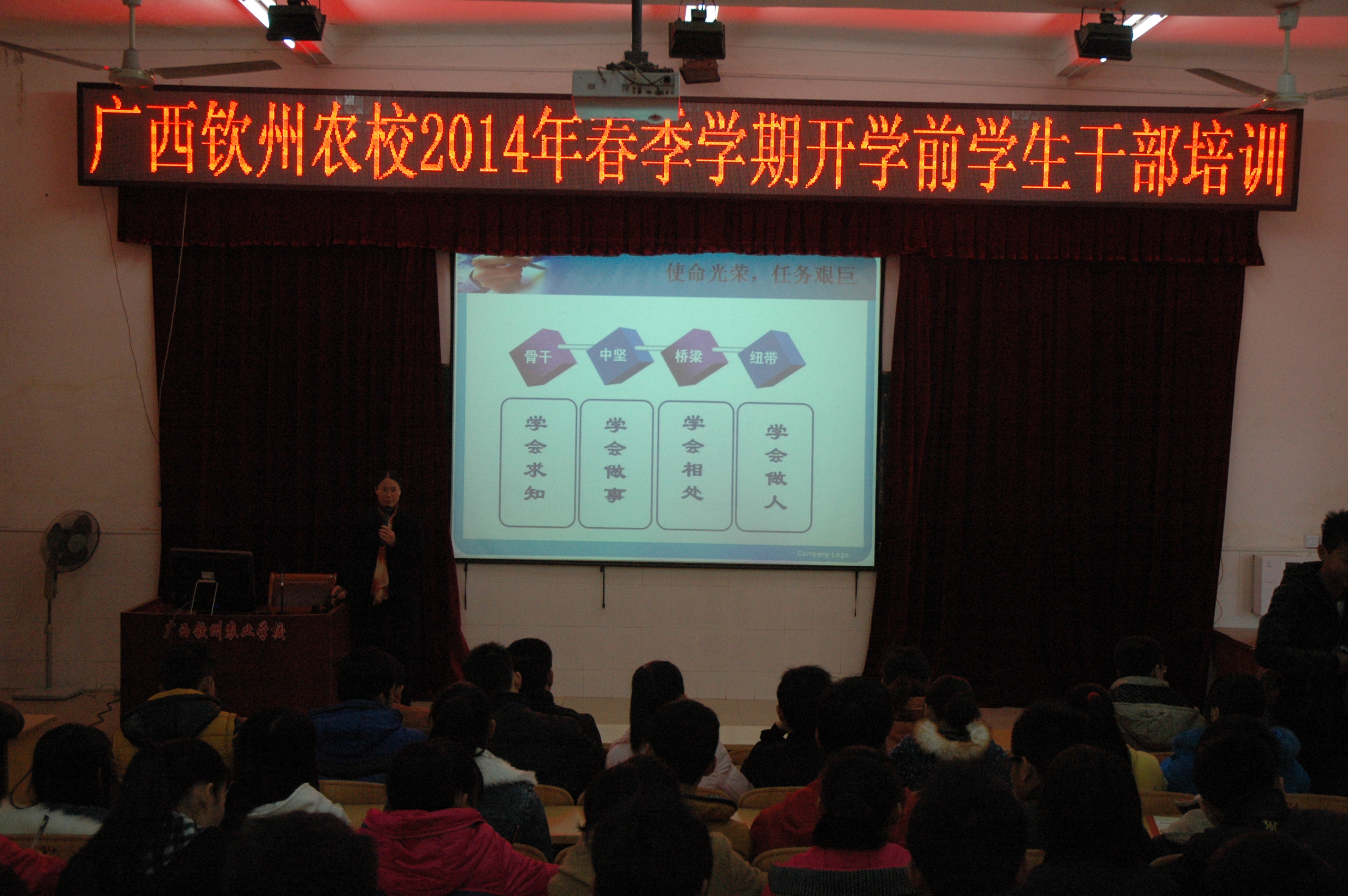 会议主要由覃一静副校长做《怎样才能做好学生干部》专题讲座。然后由学生科邓业斌科长做《怎样提高学生干部工作能力》专题讲座。
