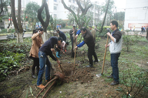 主校道两旁,师生共奏一曲美化校园的鸣奏曲。在植树现场,教师们挥锹铲土,挖坑、移树、扶苗、培土、踩实、浇水,同学们推车拉土,大家干劲实足,配合默契,不怕累,不怕脏,忙得不亦乐乎。经过一个小时的努力,总共栽植荷兰铁、春雨、棕竹等一批树苗,为“绿色校园”锦上添花。