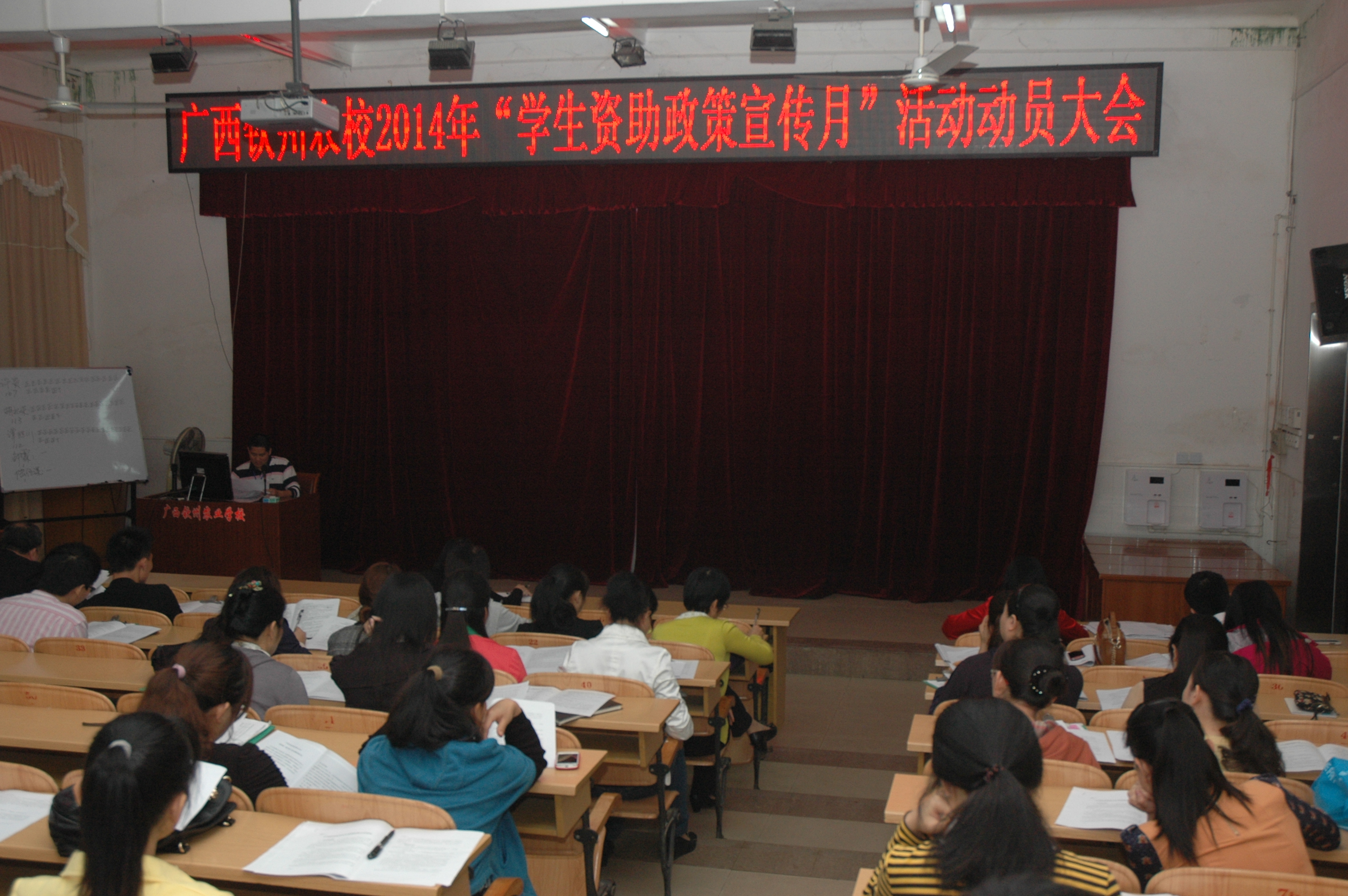为使国家学生资助政策家喻户晓、深入人心,让更多的人对国家非义务教育阶段家庭经济困难学生资助政策有更全面和深入的了解,确保各项政策更好的实施。我校于2014年4月7日在学校电化室召开2014年“学生资助政策宣传月” 活动动员大会,学生科邓业斌科长在会上作了开展“学生资助政策宣传月”活动的动员讲话,解读了“学生资助政策宣传月”的活动方案。
