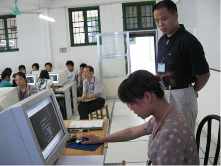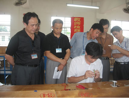 刘波校长(左一)在仔细观看陈文浩老师的“可控台灯制作”比赛伍国樑副校长在仔细观看黎燕老师的“CAD设计”比赛参赛教师回答专业评委的提问教学评委认真观看“CAD设计”操作演示
