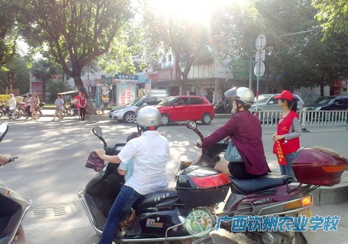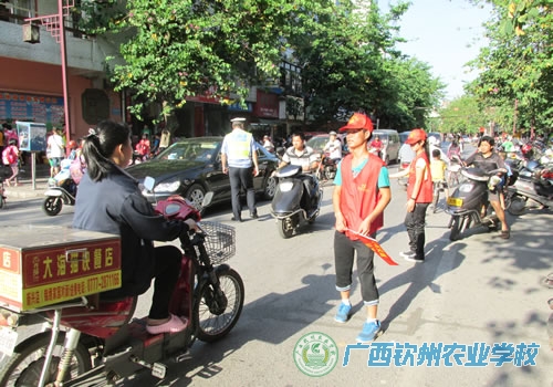 “请等到绿灯亮时再走斑马线过马路,谢谢。”2014年5月14日下午,我校团委组织的16名青年志愿者戴着“钦州志愿者”小红帽,身穿红马夹,手持“文明交通”小红旗走上街头,在小花园路口配合执勤交警进行文明交通劝导,为炎炎夏日增添了一抹靓丽的风景。