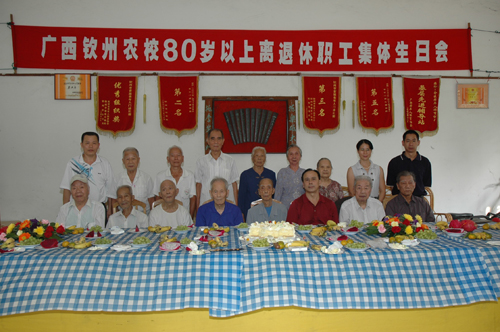 为了丰富我校离退休人员的晚年生活,促进老年人身心健康,营造和谐的校园,钦州农校举行丰富多彩的敬老活动。主要活动有:①给80岁以上的离退休职工过集体生日,学校领导和13位老同志一起参加了活动;②组织了40多位老同志参观风生水起北部湾,参观的地方有:钦州市行政中心、梦园、中石化集团、金桂纸桨厂、钦州港口码头等;③为学校老年活动中心添置了健身和娱乐乐器材;④给离退休职工发放节日慰问品。