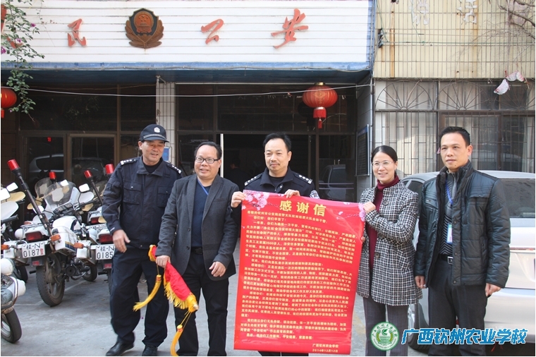 公安干警无私奉献、惩治犯罪、保一方平安的精神,值得我们永远学习,值得我们敬佩。为了进一步增进警民情感,加强警民共建活动,携手保护校园平安,为共同营造“平安钦州”作出更大贡献。怀着对公安干警的崇高敬意和感恩之心,2014年12月12日下午,学校领导覃一静副校长带领保卫部门同志分别到钦州市公安局沙埠派出所和钦州市公安局巡警支队钦南巡逻大队对公安干警进行慰问,对他们为我校创建平安校园作出的努力和贡献表示衷心的感谢,并向他们赠送精美的感谢信和锦旗,同时,希望他们一如既往地帮助和指导我校的安全保卫工作,为学校更好更快地发展保驾护航。
