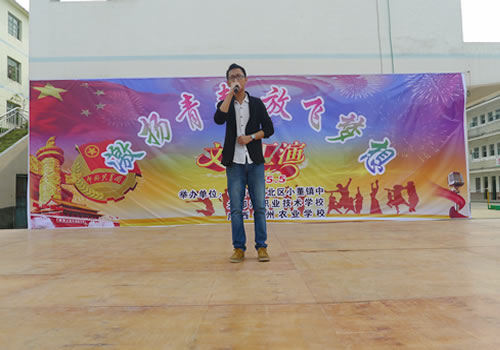 2015年5月5日下午,我校覃一静副校长带领招生与就业指导办公室、团委、学生社团成员师生一行20多人,到钦北区小董镇中参加“激扬青春 放飞梦想”文艺汇演。舞蹈队、音乐社、鬼舞社的同学们代表学校参与了节目的演出,精采的节目赢得场下师生们的连连喝彩和热烈的掌声。