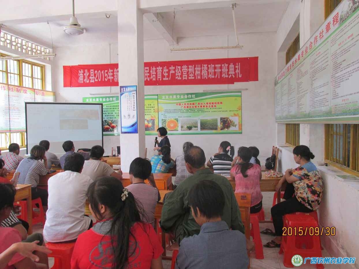 本次培训是从9月24日在浦北县龙门镇龙发水果合作社开班的,浦北县农业局精心组织了龙门镇樟家村委的47名柑橘种植大户集中到合作社进行了为期15天的培训,其中集中培训7天,田间实训8天。我校组织专业理论深厚、实践经验丰富的高级讲师对学员进行授课,主要课程有柑橘栽培技术、柑橘栽培管理(实训)、农产品市场营销、柑橘贮运与保鲜、柑橘采收、包装及保鲜技术(实训)、柑橘病虫害综合防治、柑橘病虫害识别与防治(实训)、农产品质量安全知识及生态乡村、农产品农药残留检测技术(实训)等课程,最后组织了学员进行理论知识考试。