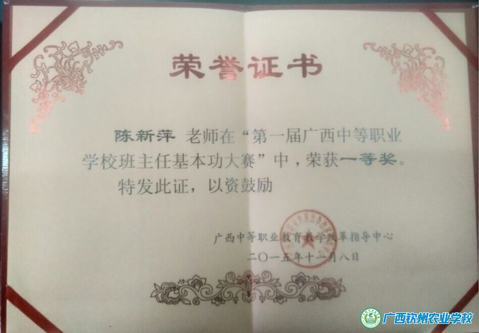 11月7日至8日,陈新萍老师代表我校班主任参加了第一届广西中等职业学校班主任基本功大赛,经过在广西师范学院两天的角逐脱颖而出,取得了一等奖。