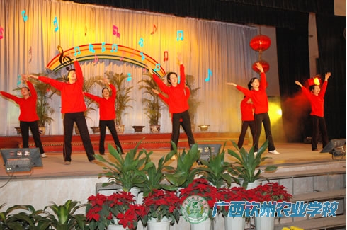 晚会现场 刘波校长致新年祝词 综合071班同学表演舞蹈《好日子》 种植组表演健身操《样样红》 学校领导与教职工一起观看师生们表演 机电组表演相声《双簧》 离退休组表演合唱《中国梦》