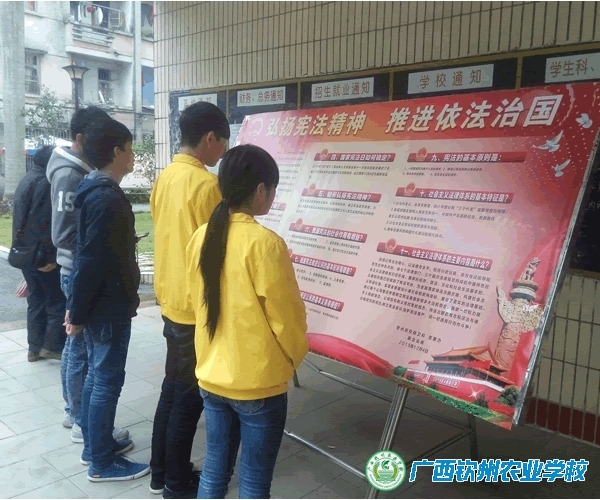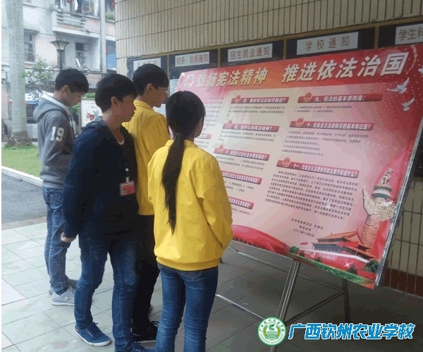 根据自治区党委宣传部、自治区司法厅、自治区依法治桂领导小组办公室等3部门联合发出《关于开展2015年“12.4”国家宪法日暨全国法制宣传日系列的通知》和自治区教育厅的工作布置,结合我校的工作实际,我校积极开展以“弘扬宪法精神,推动创新、协调、绿色、开放、共享发展”为主题的系列宣传活动。活动通过晨读、版报宣传等形式,增强了师生对宪法至上的意识。