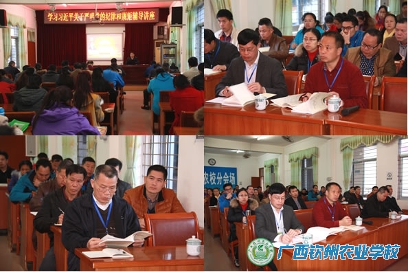 在我校全体党员“学党章党规、学系列讲话,做合格党员”学习教育深入进行时,2016年3月11日上午,厅党组成员、自治区纪委派驻自治区农业厅纪检组组长韦良同志为我校党员干部作“学习习近平关于严明党的纪律和规矩”专题辅导。学校领导、党员干部60多人参加学习辅导会。