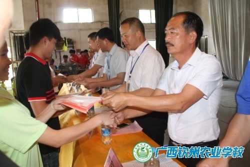 当天下午4:00,竞赛决赛颁奖仪式在钦州农校大礼堂举行。经过一天激烈的角逐,共有441名同学获奖。钦州市鑫农农业有限公司(欢乐农庄)陈家珍董事长和广西钦州农业学校领导为获得一等奖的选手颁发奖状,并和选手合影留念。