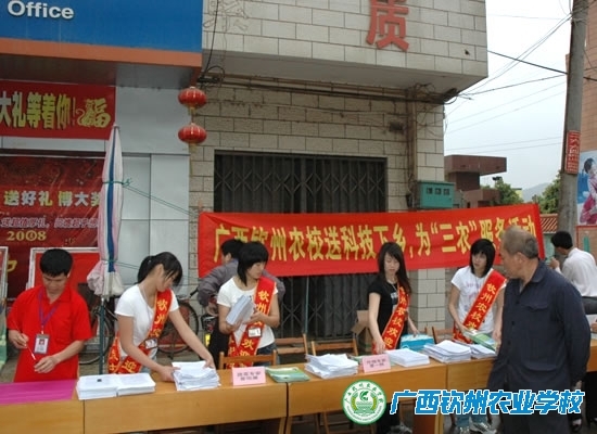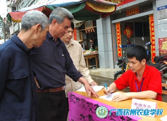“农业灾后恢复生产”农业技术咨询活动现场 左三为校长刘波,左二为副校长覃一静 果树专家为果户传授灾后果树恢复技术 养殖专家接受养殖户的咨询 我校师生为农户分发科技资料