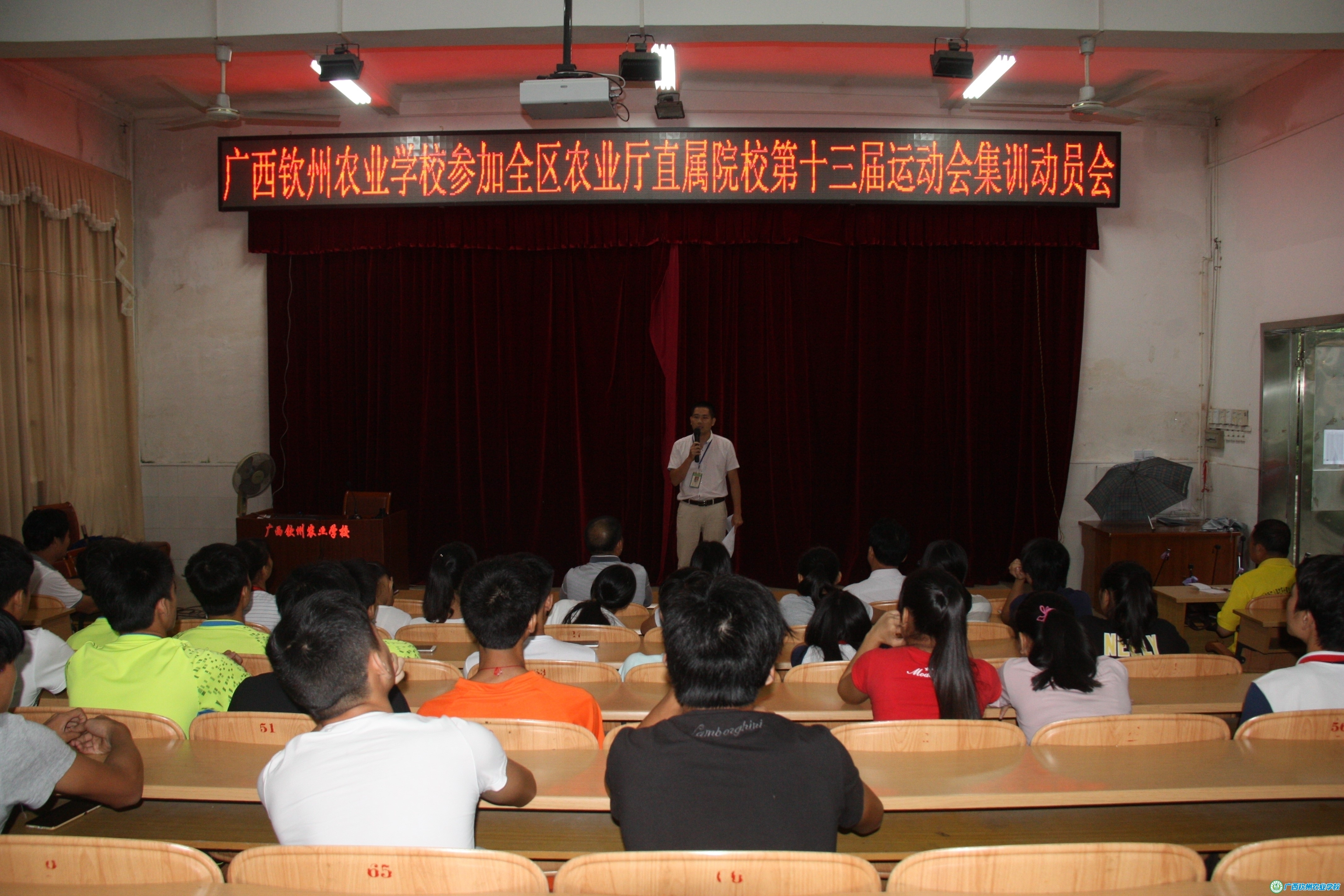 为了加强运动员们的训练意识,切实提高训练质量,7月1日下午,我校在电化教室召开参加自治区农业厅属院校第十三届运动会集训动员大会,伍国樑校长出席大会并讲话,学生科、教务科相关负责人及全体教练员、运动员参加了大会。