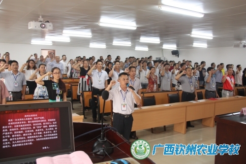 “我是一名光荣的人民教师,我庄严宣誓:忠诚党的教育事业,履行教师的神圣职责,贯彻国家教育方针,全面实施素质教育。……为中华民族的伟大复兴,为人类社会的文明进步,为钦州农校教育事业的辉煌明天,我愿奉献出全部力量。”大会在邓喜和副校长领誓、全体教职员工宣誓声中拉开帷幕。