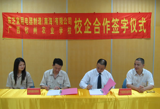 近日,我校分别与广西田园公司、东芝家用电器有限公司、东莞协盈电子有限公司举行了校企合作办学签约仪式,并为广西田园公司培训基地揭牌。