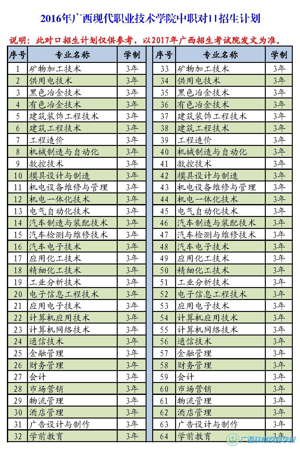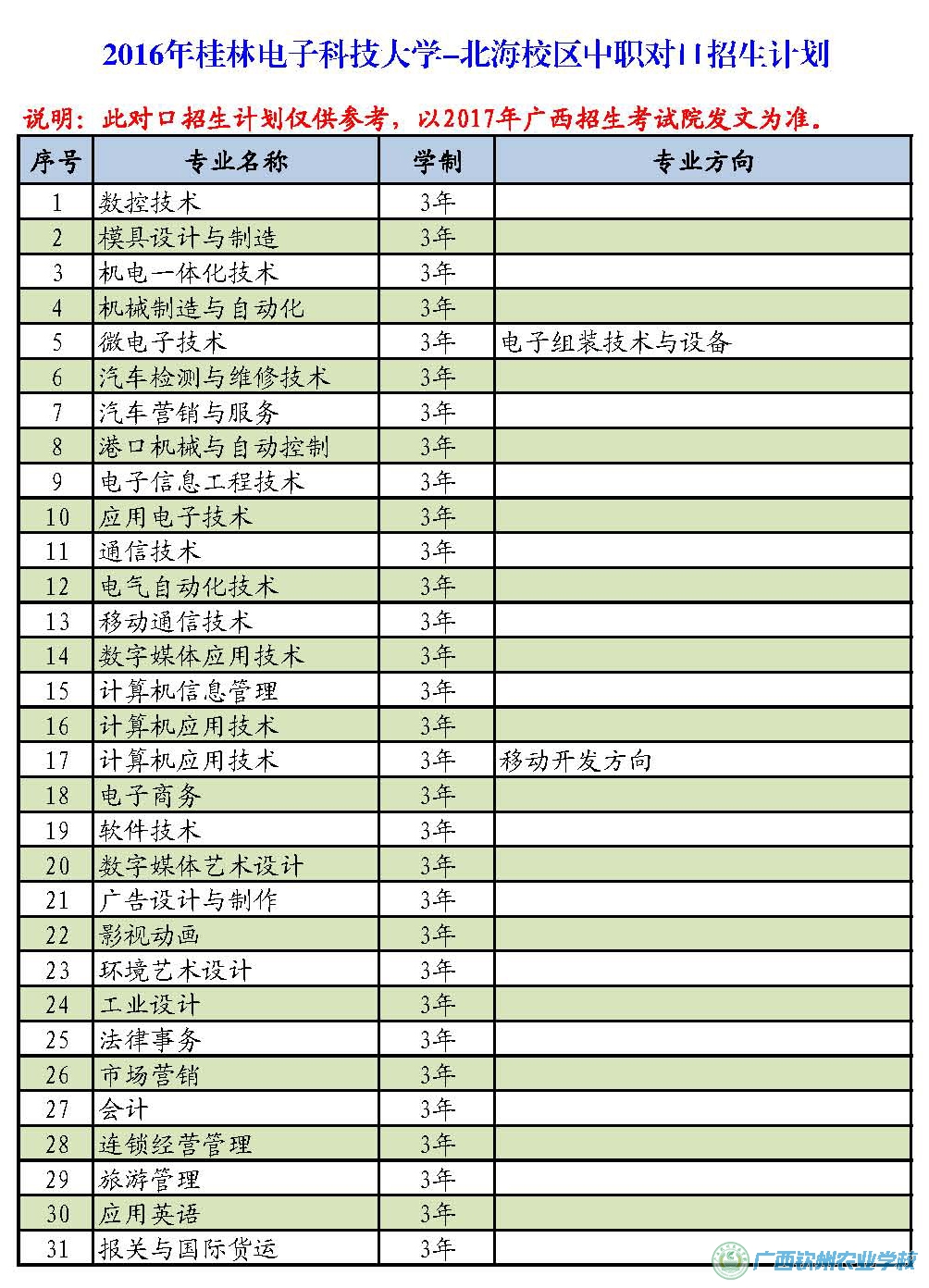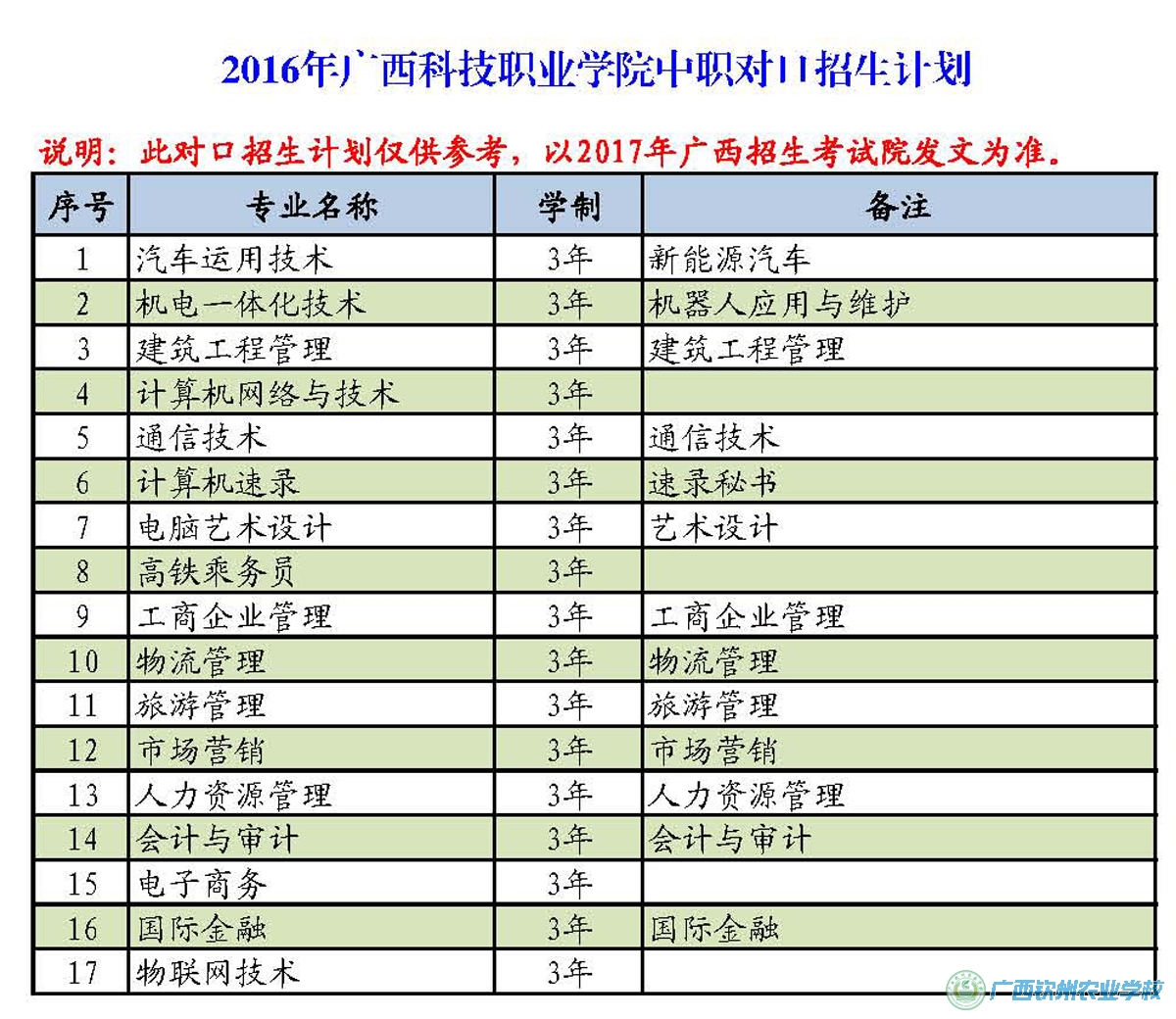 说明:广西2017年高职(大专)对口中职应届毕业生自主招生文件通知及招生计划广西招生考试院尚未行文下发,现公布的2016年本科对口中职招生计划仅作为报考学生参考了解使用,最终2017年高职(大专)对口招生计划以区招生考试院发文为准,现公布2016年高职院校招生计划不分先后排名。