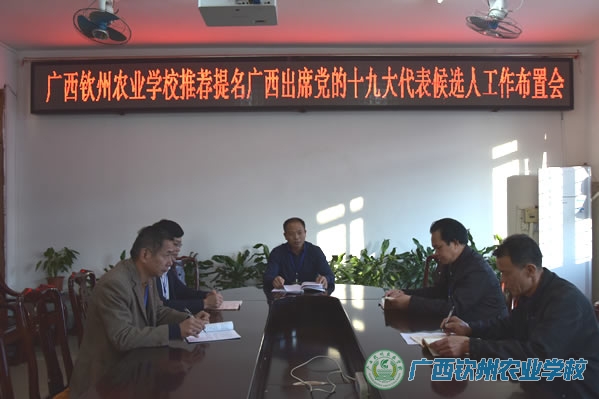 伍国樑同志在会上传达了钦州市直属机关工委关于对推荐提名我区出席党的十九大代表候选人工作的要求,介绍了推荐提名工作的意义、代表条件和结构、工作程序、时间安排及人选范围界定等内容。会议对我校推荐提名广西出席党的十九大代表候选人工作进行了部署。