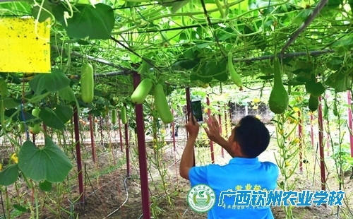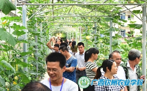 5月8-9日,正在钦州农业学校进行的2017年钦州市钦北区扶贫创业致富带头人培训班的50多名学员,在授课老师的带领下,分别前往学校的“智慧农业大棚”和现代农业示范园观摩现代农业种植技术,观赏各类奇异瓜果,着实大开眼界、叹为观止。在智慧农业大棚,学校专业老师正在带领学生对长势良好的水果型青瓜(艾美小青瓜)进行修剪老叶和侧芽,大棚里,一畦畦整齐的瓜苗逐步进入挂果盛期,可谓瓜实累累。在现代农业示范园,人们走在瓜果长廊下一个个形状各异、大小不一、颜色不同的各类奇异瓜果与你擦肩而过,这里你感觉到不是观赏瓜果,而是与它们交流了。这50多位来自钦州市钦北区的种养大户或建档立卡扶贫对象,对眼前情景啧啧称奇,都说是平生第一次看到如此美丽奇特的瓜果,这也是他们来学校培训获得的一大收获。