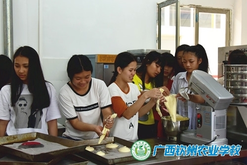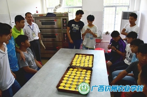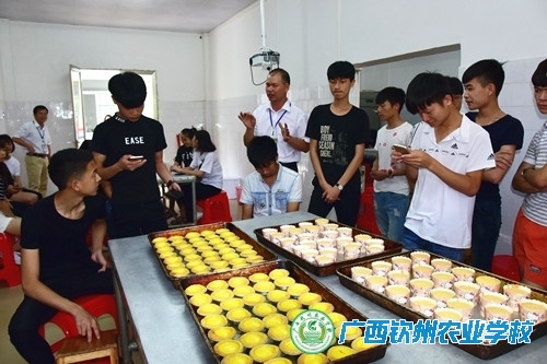 这不,当我们经过农产品加工实训室旁,经不住阵阵香气的诱惑,来到了面点加工实训室,在这里,任课的张老师指导同学们制作蛋挞,制作好的蛋挞已经放进烤箱中烧烤,同学们都怀着兴奋的心情在等候着自己的“作品”出炉,阵阵的香气就是从这里飘出去的。大约10分后,蛋挞出炉,四托色泽诱人的香喷喷的蛋挞呈现在同学面前,看着我们都垂涎欲滴了。看完了蛋挞制作,我们又来到隔壁另一个制作间,在这里,劳老师正在向同学们演示用裱花袋来手工制作肉松蛋糕,之后同学们逐一“上阵”进行实际操作,同学们兴趣很浓,达到了忘我的境界。