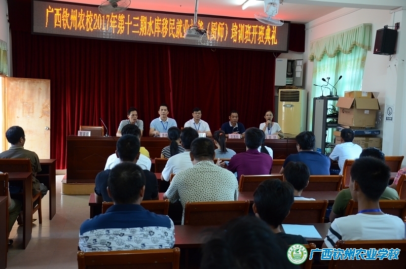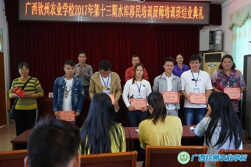 10月23日上午,我校2017年第十三期水库移民就业技能中式烹调师技能培训班结业典礼在学校第二会议室隆重举行,副校长邓喜和、钦州市钦南区水库移民工作管理局许其创主任出席结业典礼。