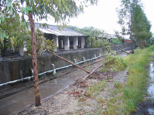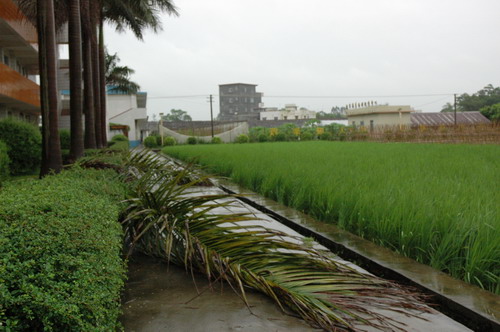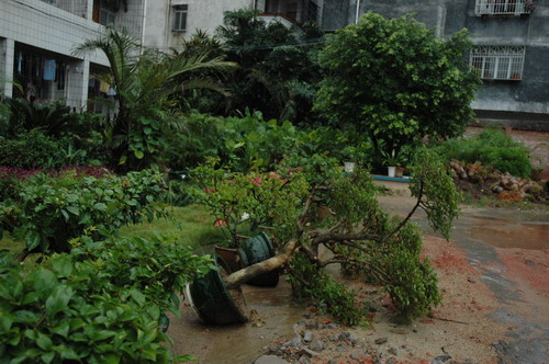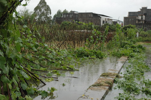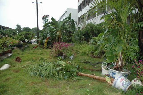 受损的实习农场的菜地和瓜田实习农场的香蕉树成片被吹倒校道旁的大王椰树枝被生生剥下实习花木场的花盆被风刮倒学校基地的绿化树被连根拔起基地猪舍石棉瓦被掀翻台风过后校道芒果树下一片狼藉