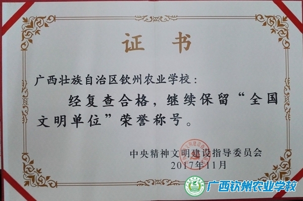 我校领导高度重视精神文明建设工作,坚持物质文明建设和精神文明建设“两手抓,两手都要硬”的战略方针,建立健全工作机构和制定工作方案,成立了由党委书记、校长伍国樑同志任组长的精神文明建设领导小组,下设办公室,从组织上确保了精神文明建设工作持久、深入、有效地开展。我校在钦州市文明委的指导下,认真贯彻中央、自治区和钦州市关于精神文明建设工作的要求和精神文明建设工作“重在建设,贵在坚持”的方针,紧紧抓住“思想教育是基础,制度建设是保证,领导干部是关键”这个中心环节,围绕我校精神文明建设“自主创新,重点跨越,支撑发展,引领未来”工作思路,下大力气加强自身精神文明建设。创建工作从规范化、制度化、经常化入手,从运作、监督、激励、保障出发,形成了良性循环的运行机制,营造了可持续发展的新局面。自从我校获得“全国文明单位”称号以来,全校师生同心同德,锲而不舍,以进取激昂的精神状态,当好“排头兵”,创建成效突出,每次复评都得到中央文明委的高度认可,我们无愧于“全国文明单位”这一光荣称号!