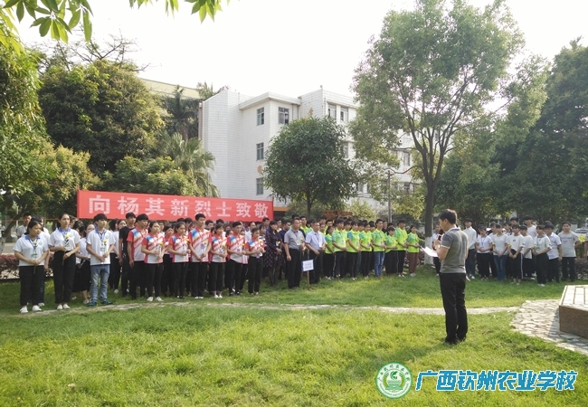 杨其新系钦州市钦北区小董镇那陵村公所屯陵村人,1975年10月出生,1992年9月考入钦州农校就读多种经营专业921班,1994年7月23日暑假返家途中,在小董镇饼岭江奋不顾身抢救落水客车乘客,光荣牺牲。杨其新牺牲后,1994年8月18日,共青团广西区委追认其为“全区优秀共青团员”;1995年9月26日,国家民政部授予其为“革命烈士”。中共钦州市委、政府和广西区农业厅分别先后做出了“向杨其新烈士学习”的决定。我校将杨其新烈士列为学校的永久性德育教育榜样,并在学校馨园建立杨其新烈士纪念雕塑,激励一代代钦农人。