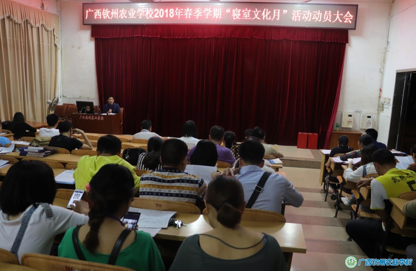 4月1日晚上,我校在电化教室召开2018年“寝室文化月”活动动员大会,安排部署“寝室文化月”活动相关工作。陈明强副校长出席大会并讲话,全体班主任参加会议。