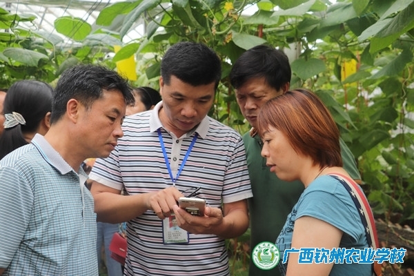 我校专业教师向邱副局长一行介绍水果型青瓜的栽培情况,并进行现场操作和讲解
