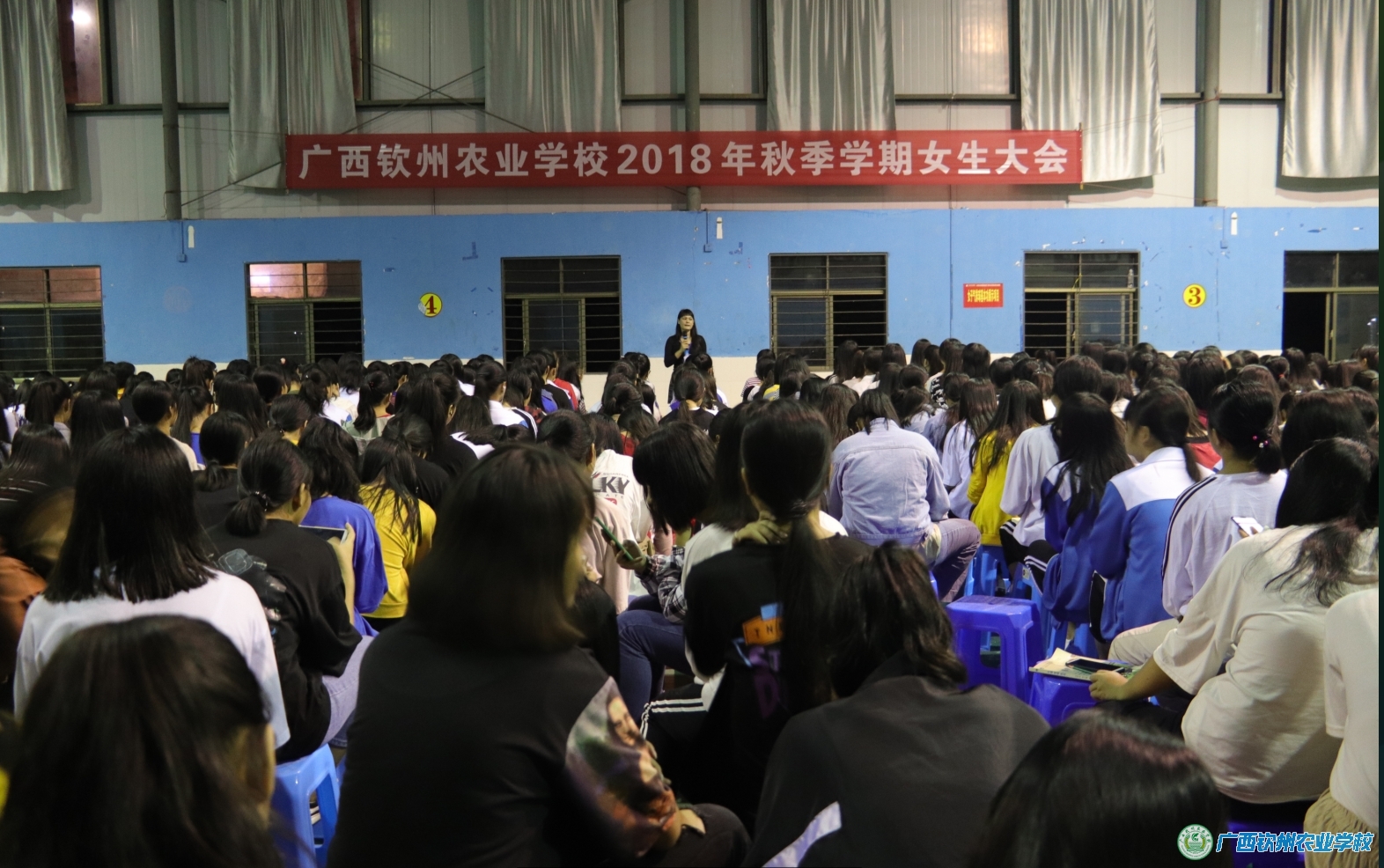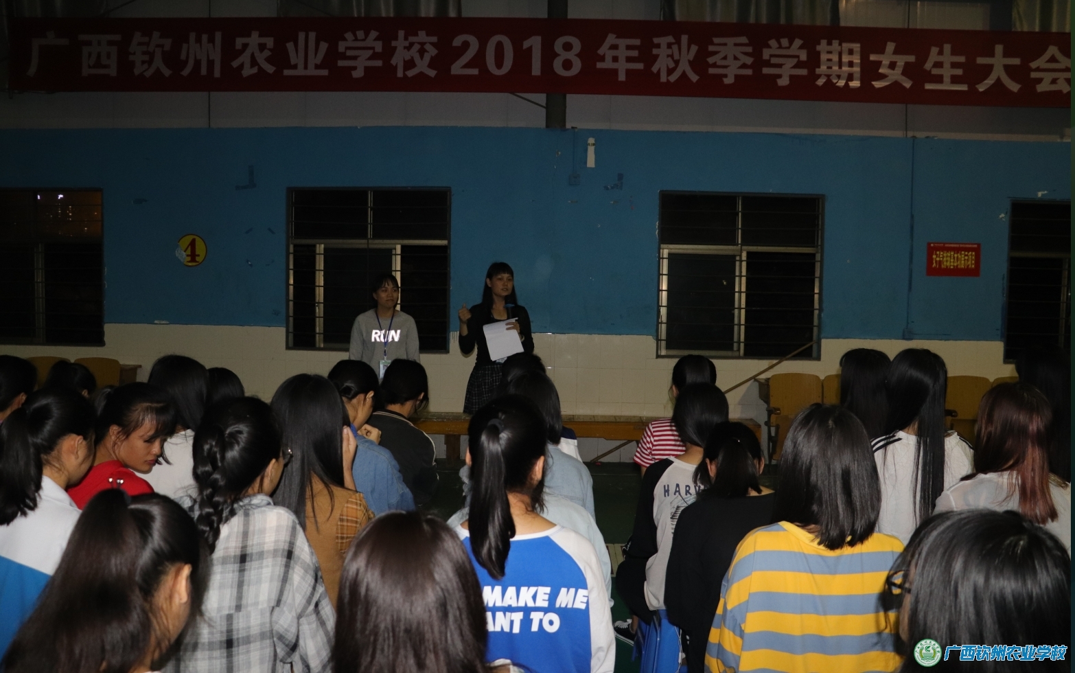 为了加强对女生的教育和管理,增强女生的自我保护意识,提高自我保护能力,更好地引导女生形成良好的学习和生活习惯,促进女生身心健康发展,2018年11月15日晚,我校在综合球馆召开2018年秋季学期女生大会。大会由学生科王白玉副科长主讲,2017、2018级全体女生参加大会。