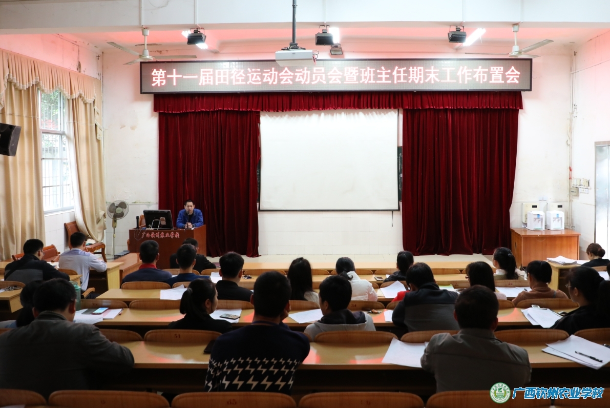我校将在12月28、29日举办第十一届田径运动会,学生科邓业斌科长解读运动会实施方案、布置期末工作并提出要求。要求全体班主任提高认识,高度重视,认真组织本班学生参赛;提高责任感,完成期末各项工作。陈明强副校长最后讲话,强调田径运动会安全事项,要求各班加强期末学生安全教育,做好预防非职业性一氧化碳中毒、消防安全、食品卫生安全、学生上下学交通安全宣传教育工作,确保本学期工作完美收官。