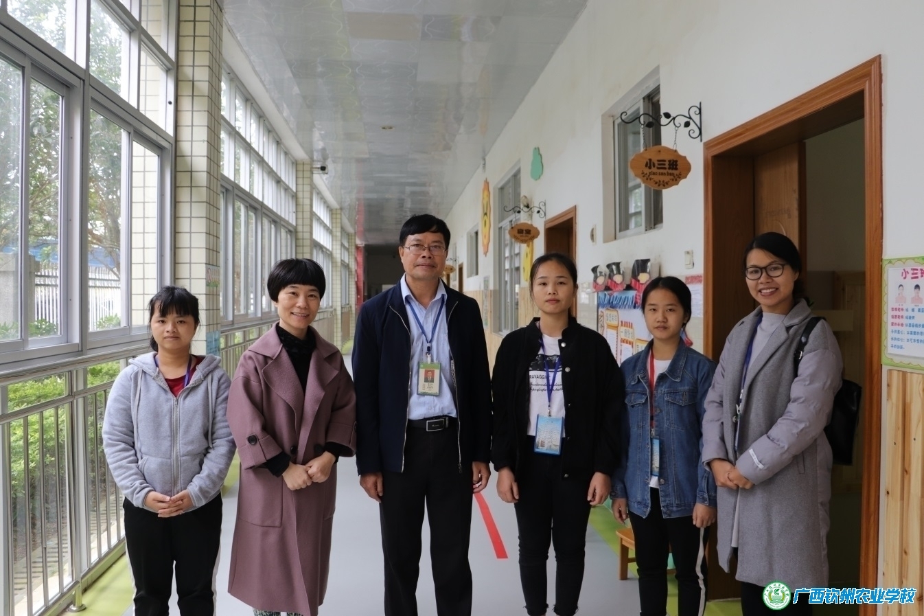 图为覃副校长、实验幼儿园张主任以及学生在实验幼儿园的合影